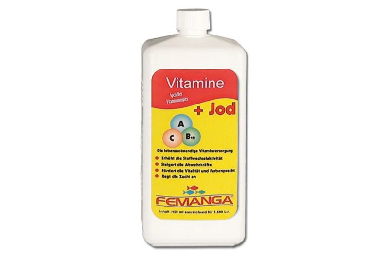 Vitamine + Jod von Femanga gibt Ihren Fischen Vitamine für einen optimalen Stoffwechsel und Jod für eine funktionierende Schilddrüsentätigkeit hinzu. Die Futterverwertung kann so opimiert werden und Ihre Fische werden vitaler und laichfreudiger.
