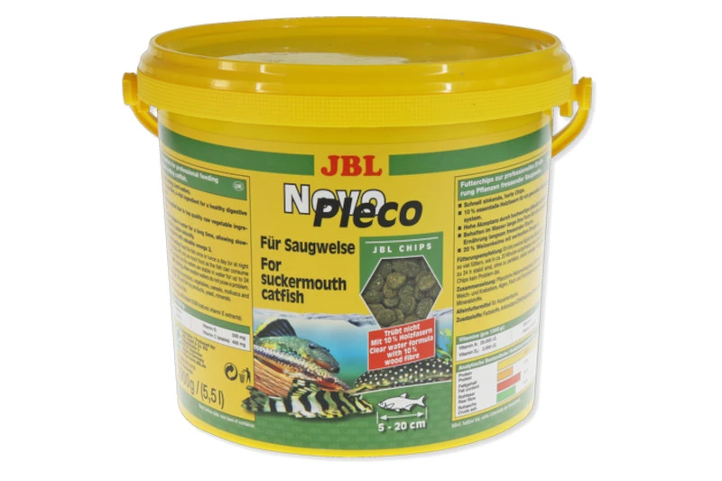 JBL NovoPlecoChips sind in einem speziellen Produktionsverfahren hergestellte Futterchips, deren Zusammensetzung und Konsistenz speziell auf die Ernährung pflanzenraspelnder Harnischwelse (Plecostomus, Ancistrus etc.) und anderer pflanzenfressender Bodenfische abgestimmt ist. Weizenkeime, Spirulina-Algen, ein hoher Grünkostanteil und 10% lebenswichtige Holzfasern sorgen für eine artgerechte Ernährung. Die schnell sinkenden Chips erreichen direkt den Lebensraum der Tiere am Boden des Aquariums. Die Wasserstabilität von JBL NovoPlecoChips sorgt dafür daß langsamer fressende Fische genügend Zeit finden zur Futteraufnahme ohne daß das Wasser unnötig mit Schadstoffen belastet wird. Stabilisiertes Vitamin C und andere wichtige Vitamine fördern die Widerstandskraft gegen Krankheiten.Fütterungsempfehlung: Täglich 1 – 2 mal (falls erforderlich, auch nachts) so viel JBL NovoPlecoChips füttern, wie in ca. 20 min aufgefressen wird. Da die Chips bis zu 24 h stabil sind, ohne zu zerfallen, stellen wenige nicht gefressene Chips keinen Nachteil dar. Alleinfutter – mit Antioxidans E306 (nat. Vit. E – Extrakte).