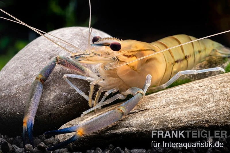 Die Rosenberggarnele, welche die wissenschaftliche Bezeichnung Macrobrachium rosenbergii trägt, kann alternativ auch als Riesenflussgarnele oder Riesenhandgarnele betitelt werden. Bei der gigantischen Süßwassergarnele handelt es sich um eine Großarmgarnele (Macrobrachium) aus den Süßwassergewässern des Indo-Pazifik. Ihr Lebensraum erstreckt sich über die Flüsse und Seen Indonesiens bis in den nord-westlichen Teil Australiens. Mit ihrer stattlichen Größe von bis zu 25 cm (ohne Scheren) ist die Macrobrachium rosenbergii aktuell die größte Großarmgarnele überhaupt. Aber die Rosenberggarnele hat noch viel mehr zu bieten. Zusätzlich zu ihrer enormen Größe besticht die Garnele durch eine optisch ansprechende transparent-bläuliche Grundfärbung. Im Hinblick auf die geschlechterspezifische Unterscheidung lässt sich festhalten, dass die männlichen Tiere größere Scheren haben als die Weibchen. Besagte Scheren können Ausmaße von bis zu 50 cm annehmen.