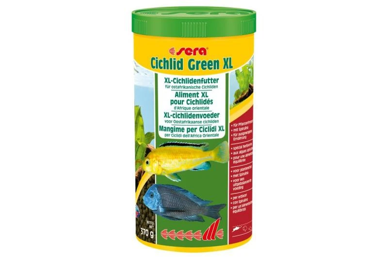 Für größere, vorwiegend Pflanzen und Aufwuchs fressende Cichliden und andere Großfische ist Sera Cichlid Green XL aus schonend hergestelltem Granulat das Hauptfutter. Pflanzliche Komponenten wie Spinat und der hohe Anteil an Spirulina-Algen (10 %) unterstützen mit ihren Carotinoiden, Mineralien, Spurenelementen und Ballaststoffen eine gesunde Verdauung und