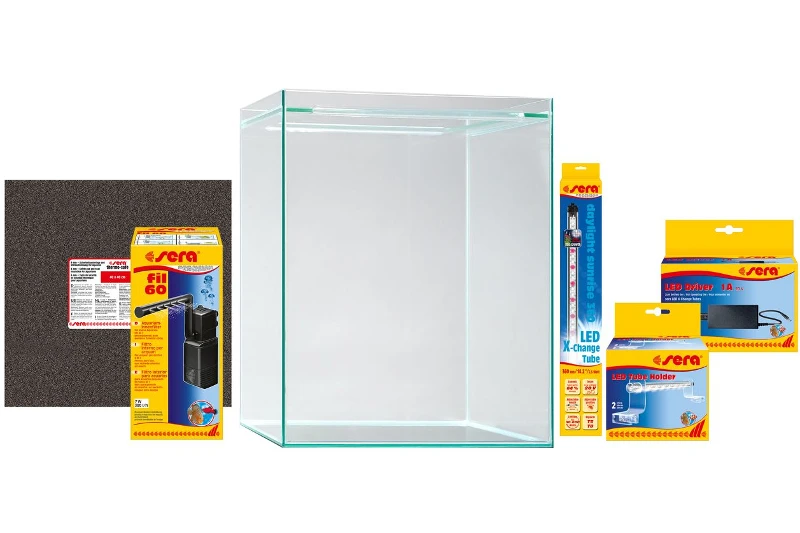 Zusätzlich zum Aquarium beinhaltet das Set den zuverlässigen Innenfilter Sera fil 60 sowie eine energiesparende LED-Beleuchtung mit der Sera LED X-Change Tube daylight sunrise, die mittels der LED Tube Holder sehr einfach über dem offenen Aquarium montiert und über das ebenfalls im Set enthaltene Vorschaltgerät angeschlossen werden kann. Die mitgelieferte Sicherheitsunterlage Sera thermo-safe reduziert die Gefahr von Spannungsrissen oder Glasbruch und dient zudem als Wärmedämmung.