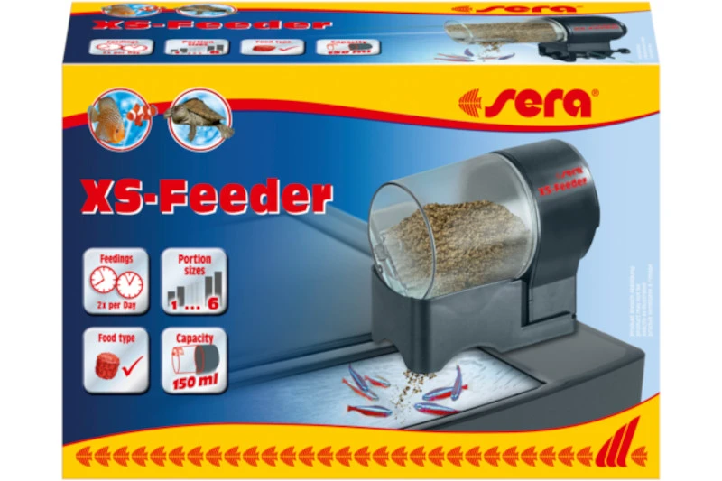 Der Futterautomat verfügt über einen großen 150 ml Futtervorrat und ist zur Fütterung von Granulaten in verschiedenen Größen ausgelegt. Die Menge des Futters pro Fütterungsvorgang wird durch einen Schieber stufenlos eingestellt. So lassen sich gleichermaßen Mahlzeiten in kleinen Aquarien als auch in größeren, gut besetzten Becken füttern. Zum Einsatz an Terrarien, z. B. zur Fütterung von jungen Wasserschildkröten, ist der Sera XS-Feeder ebenso geeignet.
